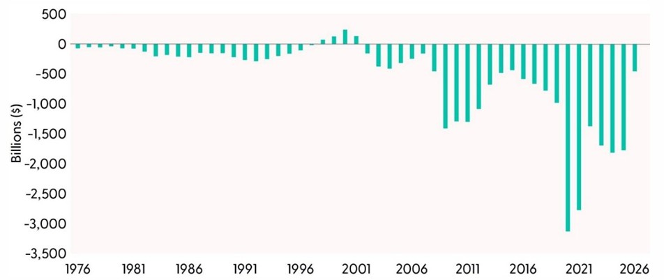 The Federal Reserve (Fed) enters 2026 navigating potentially constrained policy conditions as resilient growth and above‑trend inflation intersect with an increasingly unsustainable fiscal trajectory. Fed Chair Jerome Powell emphasized that federal debt growth requires eventual corrective action, even if near‑term market risks remain limited. Rising primary deficits at near full employment further limit long‑run policy flexibility, while expanding Treasury financing needs — and a growing reliance on short‑duration bills — heighten rollover risk and amplify sensitivity to the Fed’s policy rate.