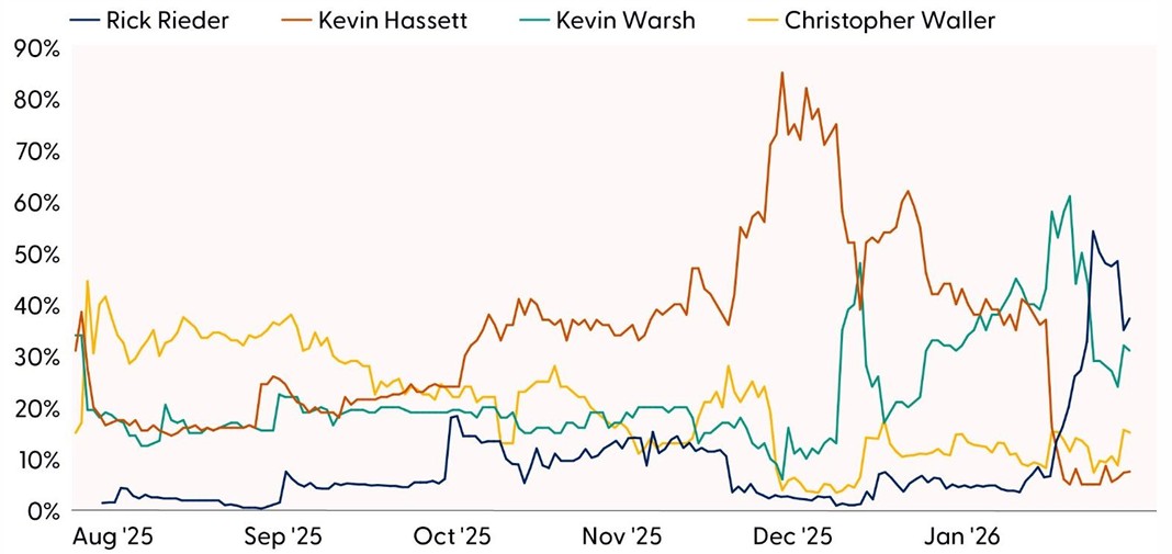 For much of this period, markets lacked clarity on which candidate would emerge as the frontrunner, with betting markets rotating among the four and elevating each as the favorite at various points over the past six months. Ultimately, the uncertainty resolved only at the end of the process, when President Trump nominated Kevin Warsh for the role — confirming what had previously been only one of several plausible outcomes.