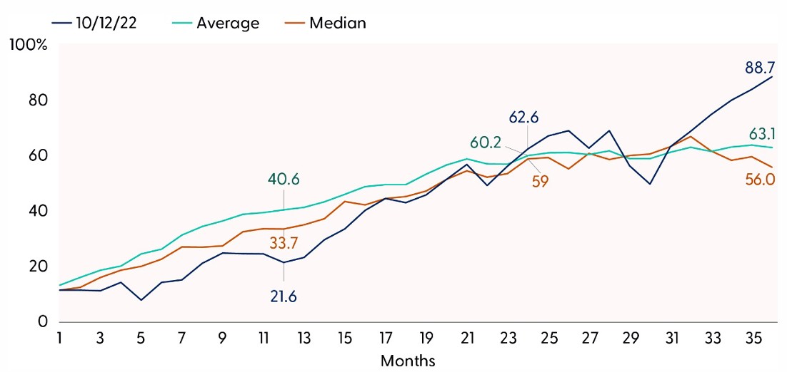 Three-year performance progression of S&P 500 bull markets since 1950 (%)