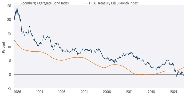 Past performance is no guarantee of future results. All indexes are unmanaged and can’t be invested in directly. The Aggregate Bond Index has been maintained by Bloomberg L.P. since August 24, 2016. Prior to then it was known as the Barclays Capital Aggregate Bond Index and was maintained by Barclays. From June 1976 to November 2008, it was known as the Lehman Aggregate Bond Index.