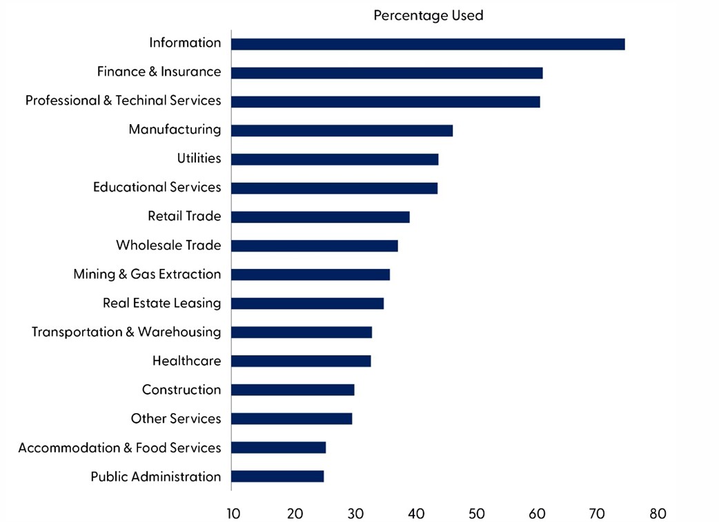 U.S. productivity growth surged to 4.9% in Q3 2025, largely because output grew far faster than hours worked. According to the Bureau of Labor Statistics, real value‑added output increased 5.4%, while hours worked rose only 0.5%, meaning companies produced significantly more without a comparable increase in labor input. This dynamic — strong output gains paired with minimal hiring — reflects firms’ continued adoption of more efficient processes, including automation, data‑driven decision tools, and other technologies that raise output per hour. Later in this piece, we show that many industries have further to go to increase artificial intelligence (AI) adoption rates.